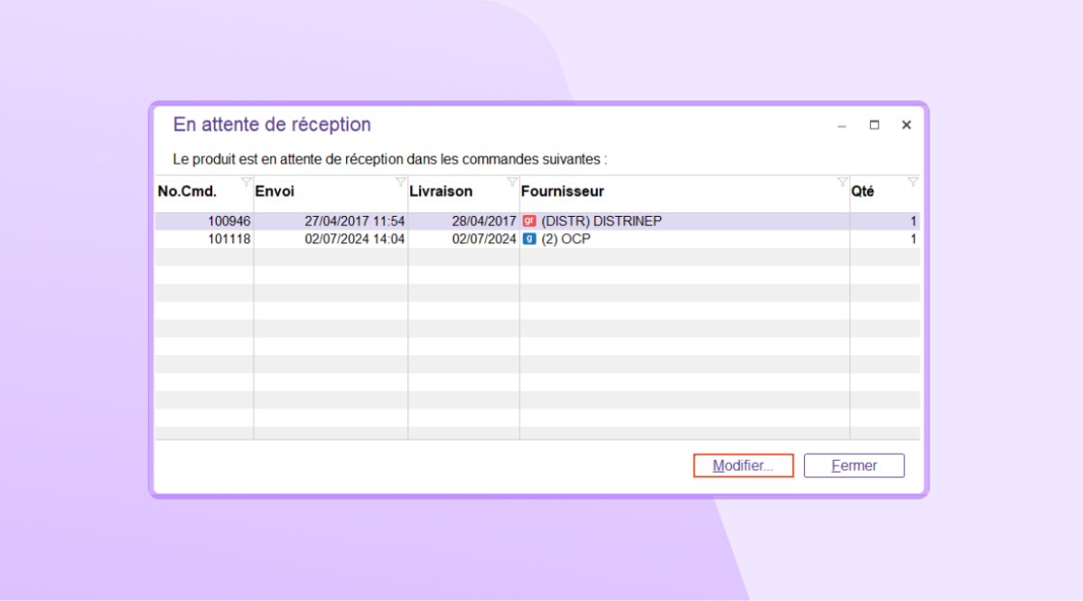 Retrouvez facilement une commande contenant un produit en attente de réception directement depuis la fiche produit, avec accès rapide aux détails fournisseurs et quantités restantes.