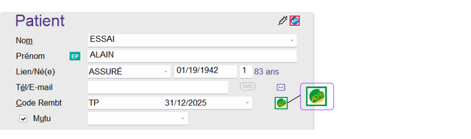 Sur la fiche patient, l’icône ADRi permet d’identifier rapidement l’état de récupération des droits Assurance maladie.