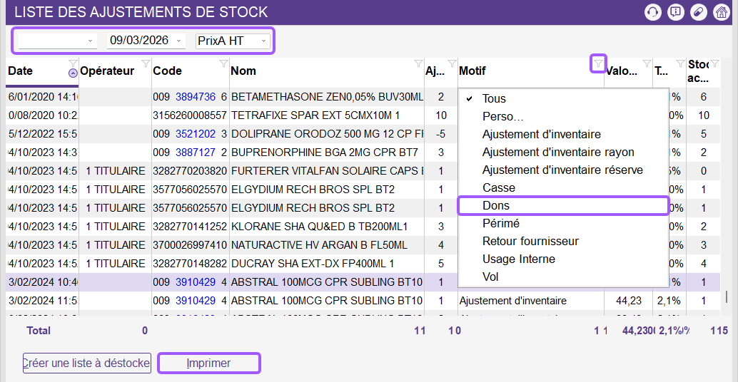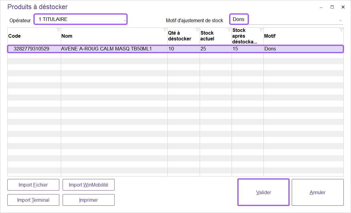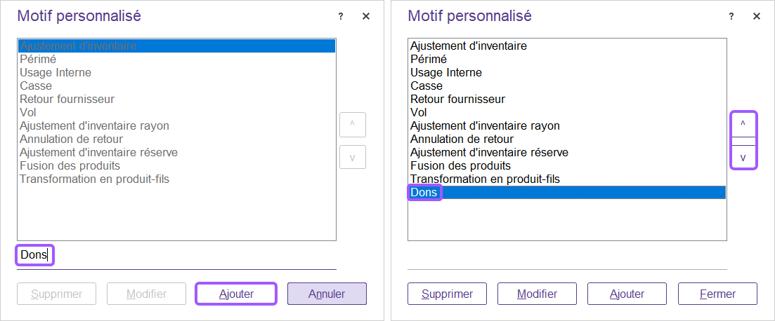 Avant de pouvoir déstocker un produit avec le motif « Dons », vous devez au préalable créer ce motif dans votre logiciel.