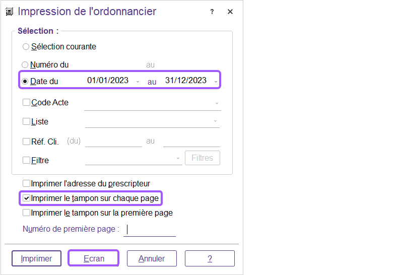 Pensez à cocher “Imprimer le tampon sur chaque page” ou “Imprimer le tampon sur la première page” puis cliquez sur “Imprimer” si vous souhaitez l’imprimer et/ou sur “Ecran” si vous souhaitez le graver sur un CD.