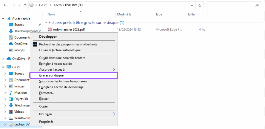 Ensuite, faites un clic droit sur votre icône CD et sélectionnez l’option “Graver sur le disque”.