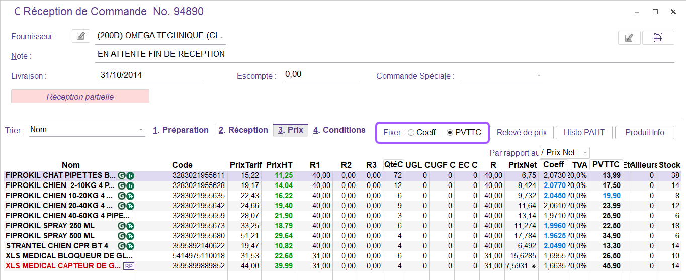 Lors de la réception financière le « Coeff » sera fixé par défaut comme indiqué sur l’image ci-dessus. Une augmentation de prix d’achat HT avec ou sans remise modifie dans ce cas le prix de vente TTC tout en conservant votre marge préalablement établie.