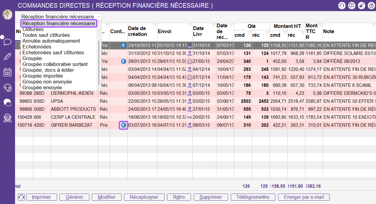 Le logo « € » vous indique que la commande est en étape de réception financière car elle est réceptionnée entièrement.