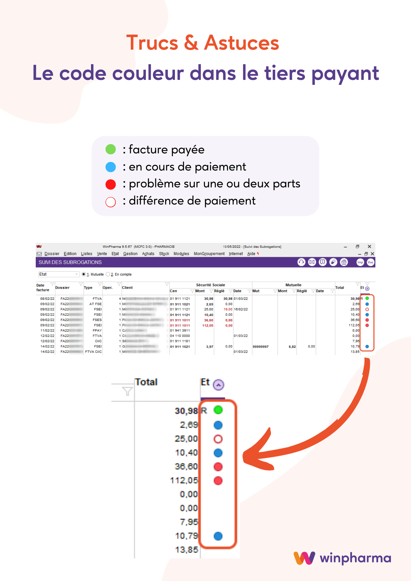 Vous l’avez certainement remarqué dans le suivi des subrogations de Winpharma (menu : Listes / Suivi des subrogations), les différentes lignes sont suivies d’une bulle de couleur. Winpharma a mis en place un code couleur pour vous permettre de vérifier en un coup d’œil les règlements effectués, en attente ou encore ceux qui rencontrent un problème ou une absence de paiement.