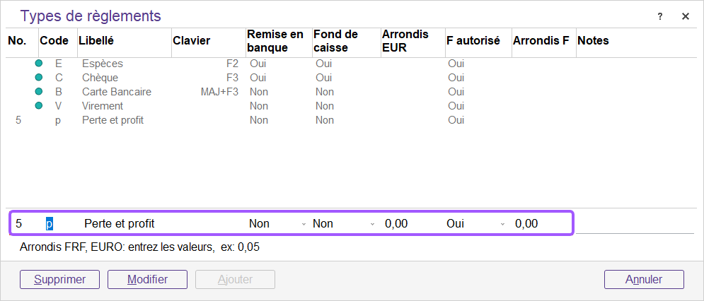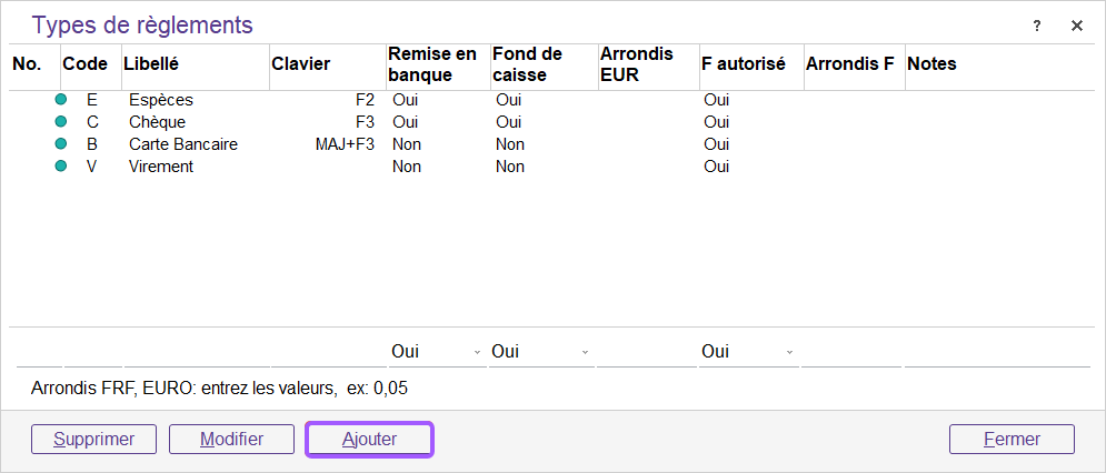 - La fenêtre “Types de règlements” s’ouvre puis cliquez sur “Ajouter”.