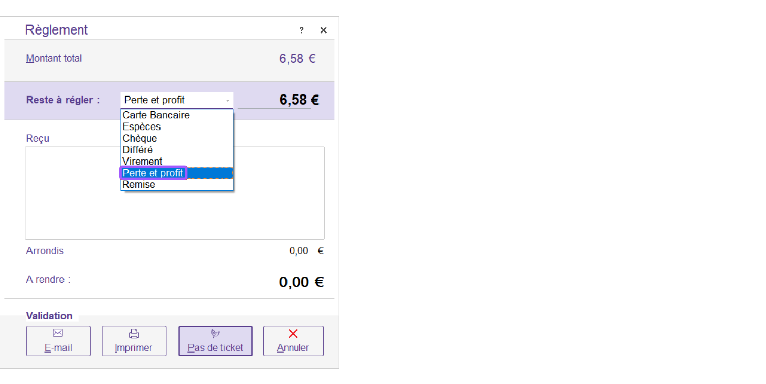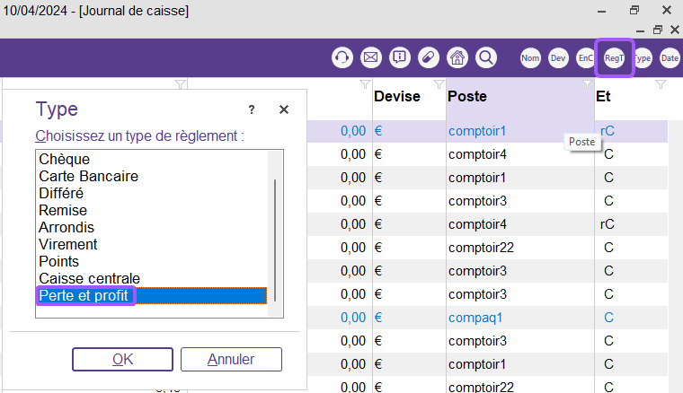 Pour avoir le détail des règlements “Perte et profit” rendez-vous dans le menu Listes > Journal de caisse.