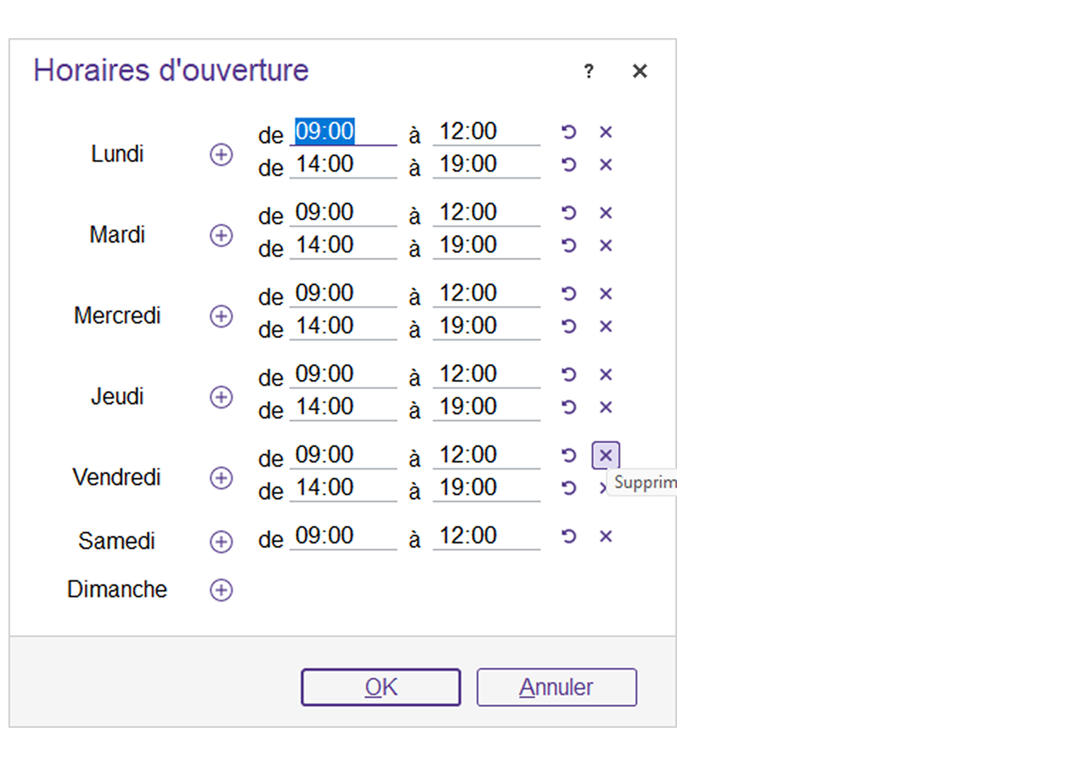 Le bouton “Horaires d’ouverture” vous permet d’indiquer les horaires d’ouverture de la pharmacie.