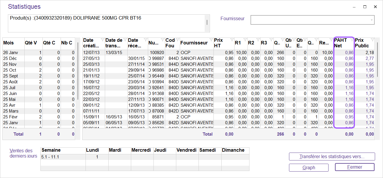 Via la liste produit, vous pouvez cliquer sur le bouton “Statistiques“ en bas à gauche puis “Statistiques produit“ afin d’avoir la liste de toutes les commandes et leur prix d’achat pour chacune d’entre elles.
