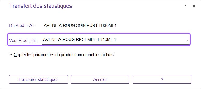 Il est conseillé d’éviter les fusions de produits, vous pouvez transférer les statistiques du produit remplacé vers le produit remplaçant via la liste produit en cliquant sur le bouton “Plus“ puis “Transférer les statistiques vers“ et sélectionner le produit remplaçant.