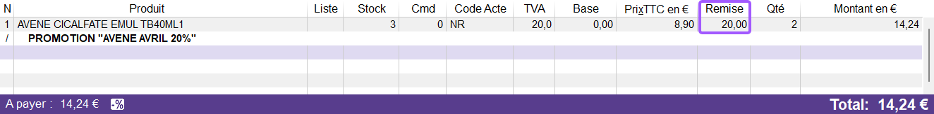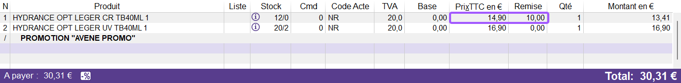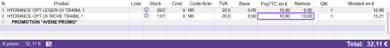 Si j’ajoute plusieurs produits en facturation de la gamme “HYDRATATION” de chez AVENE, une remise de 10% sera appliquée sur le produit le moins cher des deux produits saisis en facturation.