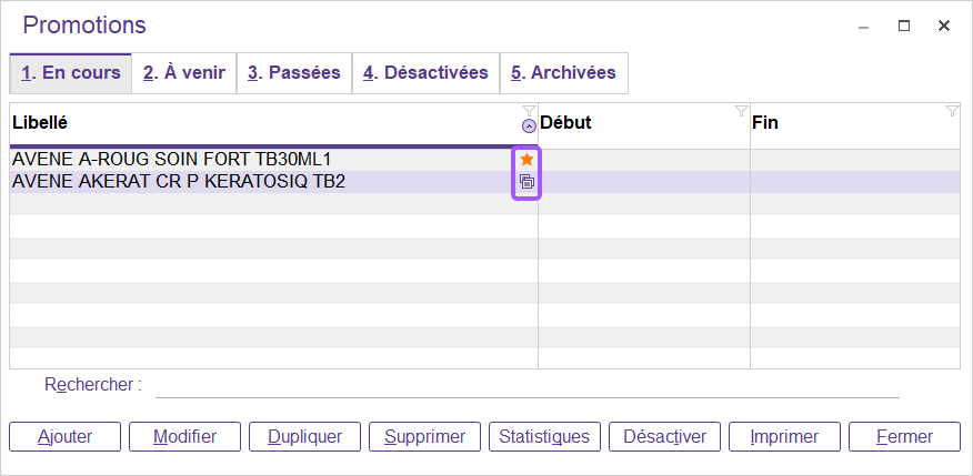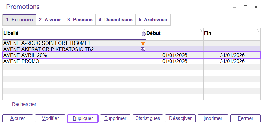Vous devez vous rendre dans le menu Gestion > Promotion puis cliquer sur la promotion que vous souhaitez dupliquer (en général dans l’onglet “3.Passées”) puis cliquer sur le bouton “Dupliquer” :