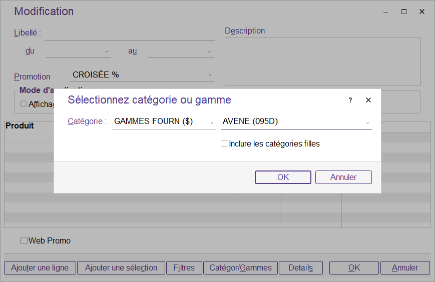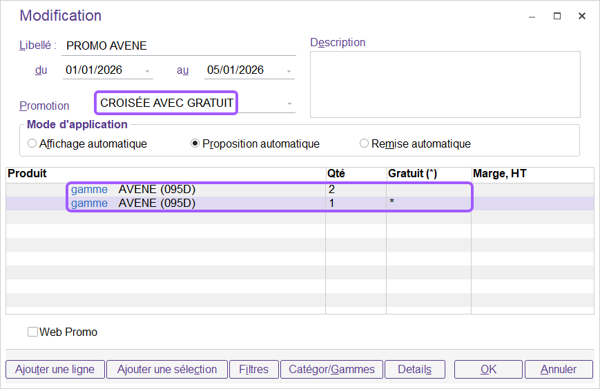 - Croisée %, €, avec gratuit : pour les promotions contenant plusieurs produits (gammes fournisseurs ou catégories) avec une remise en pourcentage ou en euros, ou avec une quantité gratuite dans le cadre d’une promotion 1 acheté = 1 offert