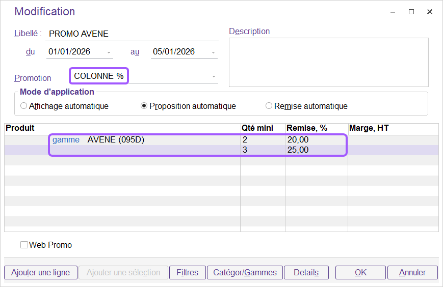 - Colonne % et € : pour les promotions sur un produit déclencheur avec possibilité de remises en cascade