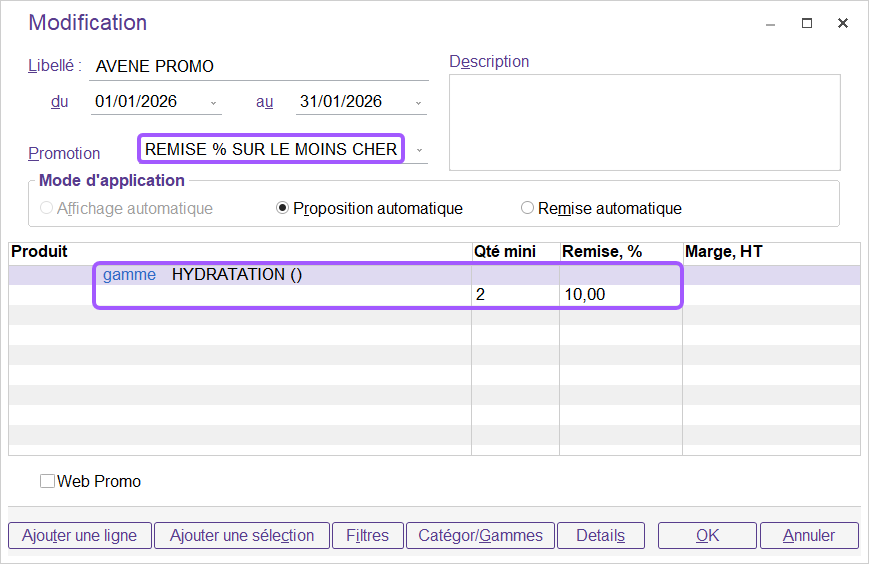 Lors de l’ajout de votre promotion il faut renseigner deux lignes :